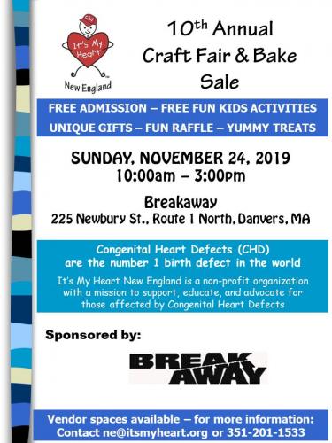 Our 10th Annual Craft Fair and Bake Sale will take place at Breakaway, 225 Newbury St, Route 1N, Danvers, MA